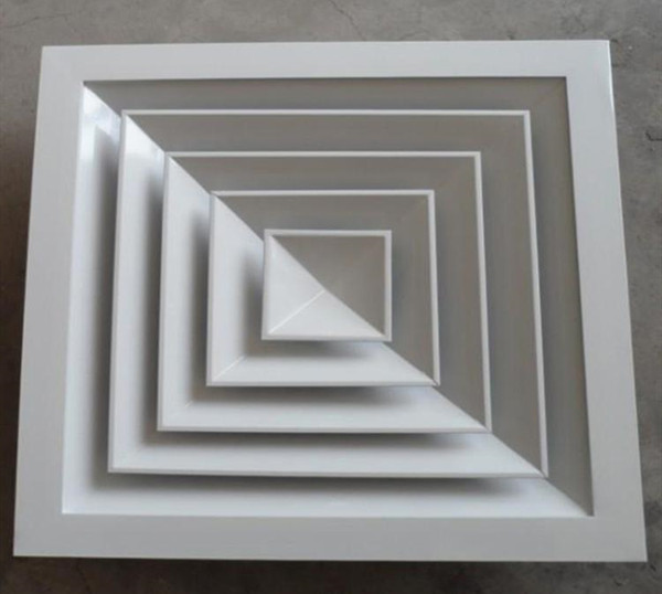 方形散流器先調挺直,表面光潔,葉片角度為固定式,葉片采用夾角片沖壓連接,整個葉片與邊框采用分離式結構,以方便安裝與調節。設計時可根據房間造型不同,選用不同出風方向的散流器,可與調節閥配套使用鋁合金表面經陽極氧化處理,也可根據用戶要求進行靜電噴塑處理。