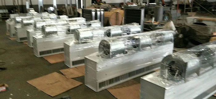 貫流式熱風幕機:貫流式電熱空氣幕是在貫流空氣幕的進風口或出風口處加上電加熱器,利用貫流風機運轉帶出的熱氣流形成的熱空氣幕。